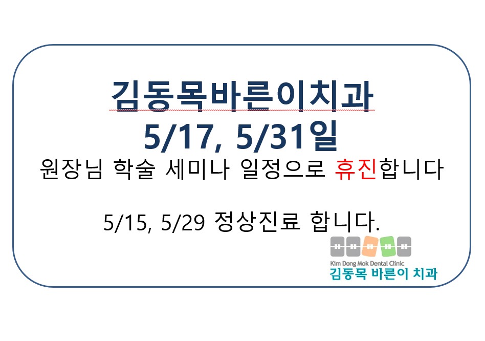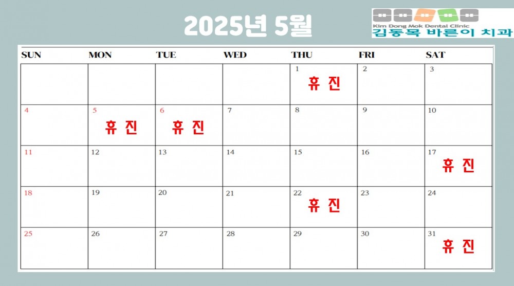 2025년 5월 진료안내입니다. 페이지 정보 작성자 김동목바른이치과 작성일25-04-15 10:12 조회1,241회 댓글0건 관련링크 이전글 다음글 목록 본문 김동목바른이치과 2025년 5월 진료안내입니다. 댓글목록 등록된 댓글이 없습니다. 이전글 다음글 목록