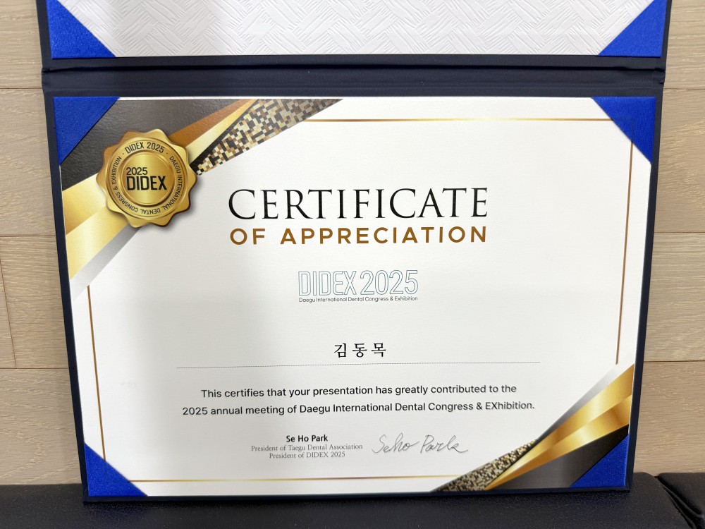 2025년 디덱스 학술대회 포스터 발표 감사장 페이지 정보 작성자 김동목바른이치과 작성일25-06-23 10:28 조회1,017회 댓글0건 관련링크 이전글 다음글 목록 본문 이번에 특허로 출원한 K-pin navi 에 대한 간략한 내용을 디덱스 학술대회의 포스터로 제출하여 감사장을 받았습니다. K-pin navi 는 김동목바른이치과의 독보적인 기술입니다! 댓글목록 등록된 댓글이 없습니다. 이전글 다음글 목록