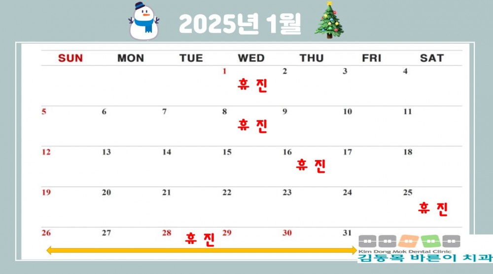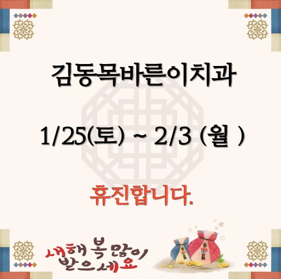 2025년 1월 진료 , 휴진 안내문입니다. 페이지 정보 작성자 김동목바른이치과 작성일24-12-14 11:10 조회1,418회 댓글0건 관련링크 이전글 다음글 목록 본문 2025년 1월 진료 , 휴진 안내문입니다. 댓글목록 등록된 댓글이 없습니다. 이전글 다음글 목록