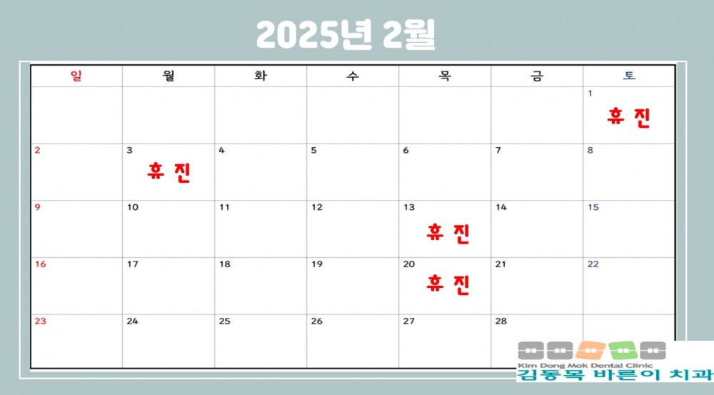 2025년 2월 진료안내입니다 페이지 정보 작성자 김동목바른이치과 작성일25-01-13 15:20 조회1,343회 댓글0건 관련링크 이전글 다음글 목록 본문 2025년 2월 진료안내입니다 문의사항 있으시면 053-562-5600 전화주시면 바로 도와드리겠습니다. 댓글목록 등록된 댓글이 없습니다. 이전글 다음글 목록