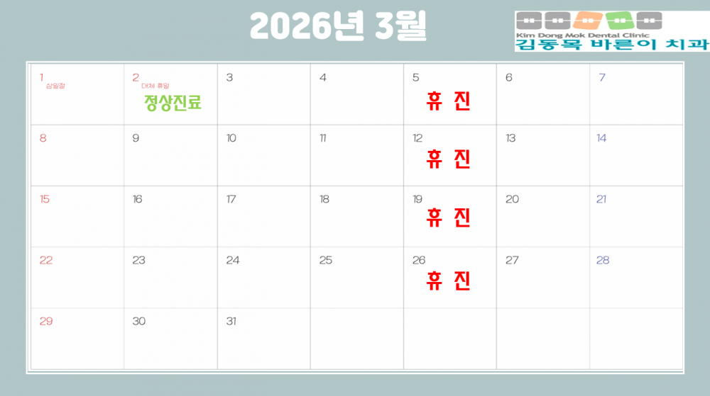 2026년 3월 진료안내입니다. 페이지 정보 작성자 김동목바른이치과 작성일26-02-23 14:21 조회277회 댓글0건 관련링크 이전글 다음글 목록 본문 2026년 3월 진료안내입니다. 댓글목록 등록된 댓글이 없습니다. 이전글 다음글 목록